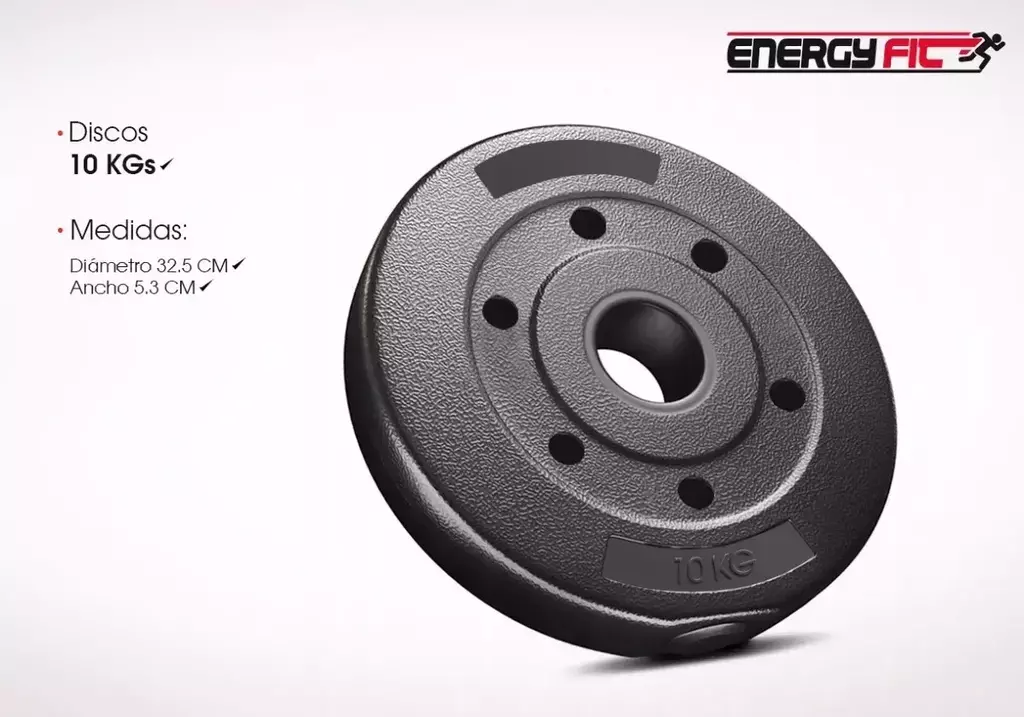 Par de discos de 10 kg cada uno, ideales para mancuernas o barras universales. Resistentes y prácticos, perfectos para ampliar tu set de entrenamiento en casa o gimnasio.