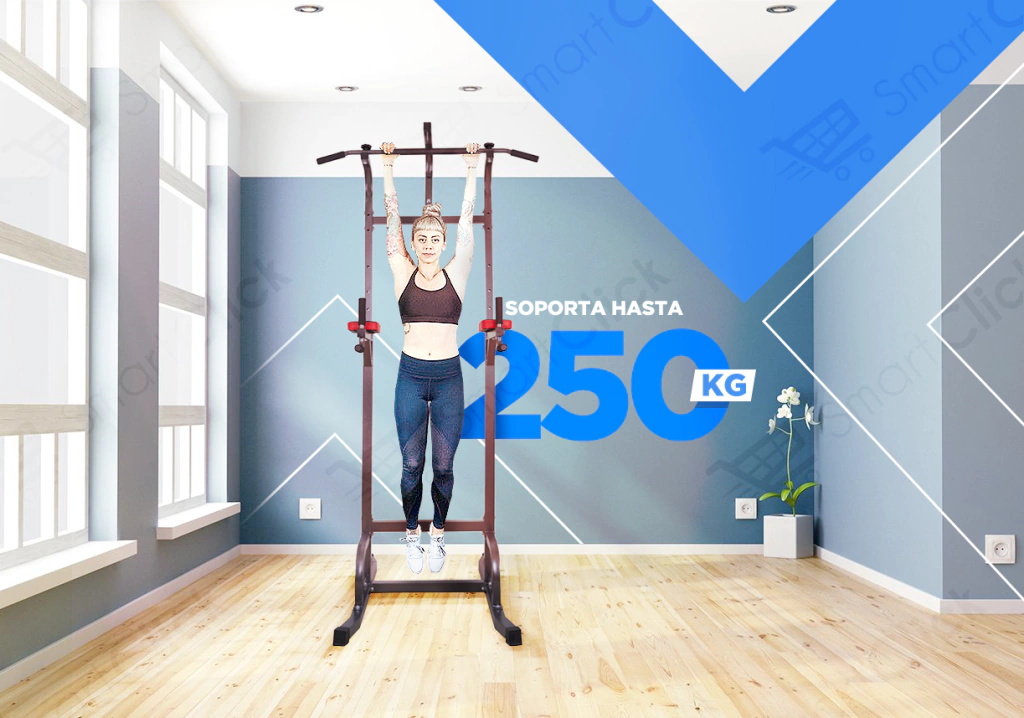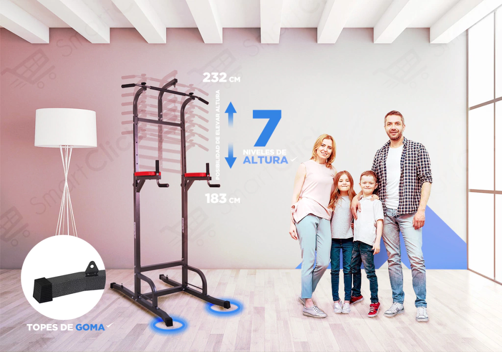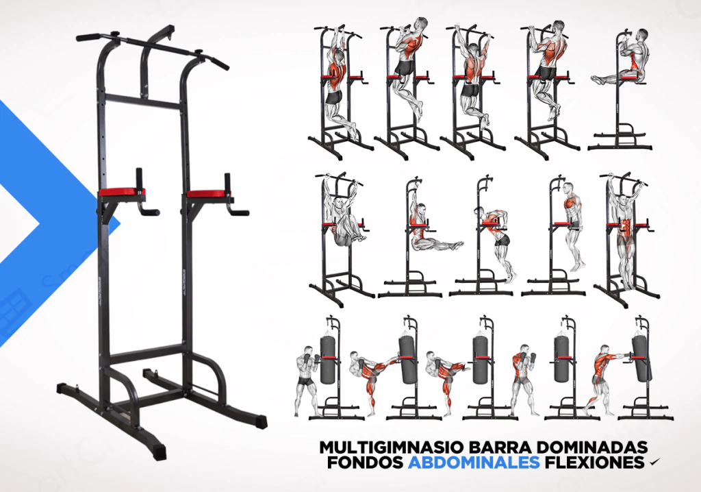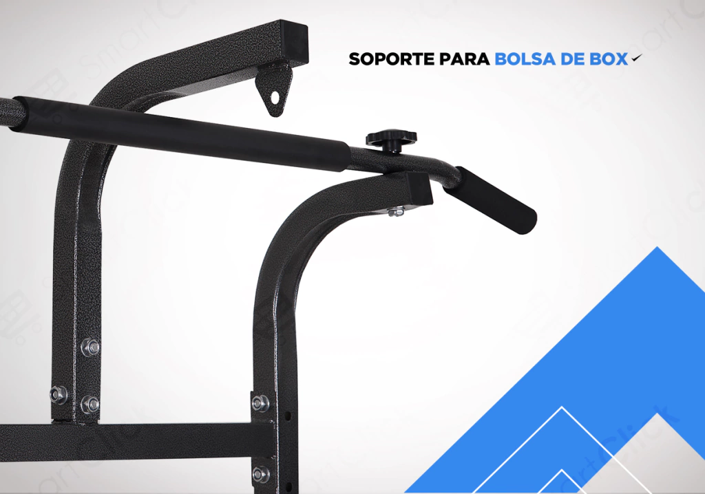 Multifunción: Estación de entrenamiento que combina múltiples ejercicios: dominadas, abdominales, fondos, flexiones de brazo y soporte para colgar una bolsa de boxeo. Entrená todo tu miembro superior con un solo producto.
